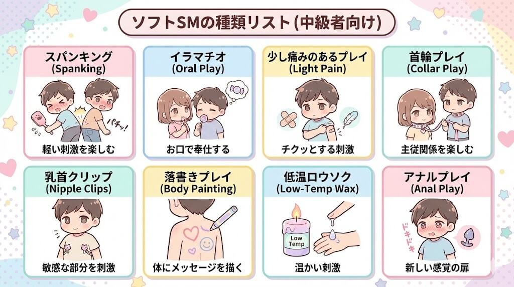 ソフトSMプレイとは、精神的肉体的な苦痛や支配関係が弱めのSMプレイのことで、イメージ的にはちょっとイジメられたり責められるプレイです。