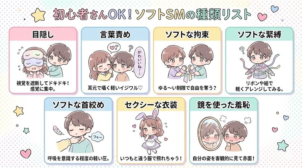 ほとんどの女性が楽しみやすいソフトSMプレイの種類をまとめてみました。気分や興奮が高めるのに役立つソフトSMプレイです。